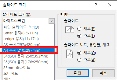 슬라이드 크기에서 방향 옵션을 세로로 변경합니다.