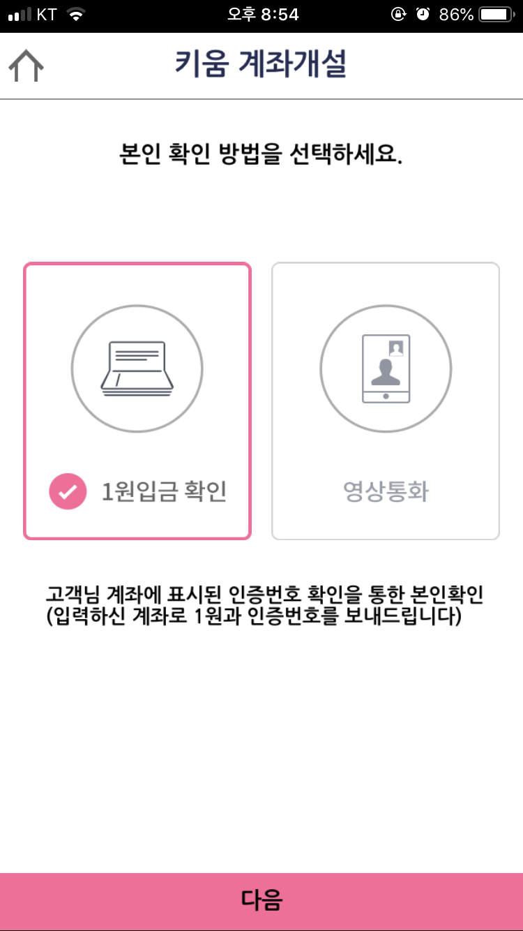그리고 본인 확인을 위해 1원입금확인 또는 영상통화 중에서 선택합니다. 영상통화는 평일 8:30~21:00까지만 가능하기 때문에-그리고 영상통화로 본인 확인을 하는게 부끄럽기 때문에...-1원입금 확인을 선택하였습니다. 본인 명의의 다른 은행 계좌가 있으면 가능합니다.