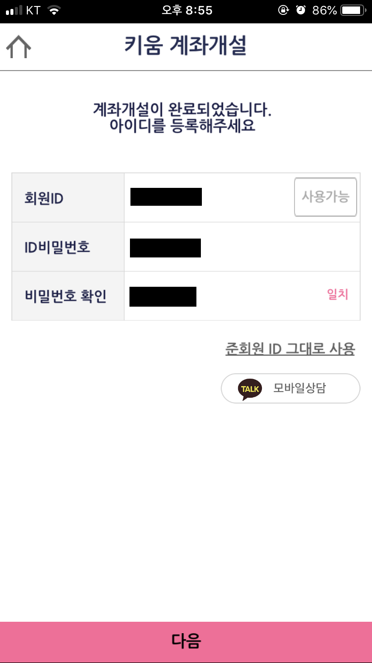 은행 앱으로 들어가 키움***으로 입금된 내용을 확인하고, 그 숫자를 인증번호 입력란에 입력하면 됩니다.