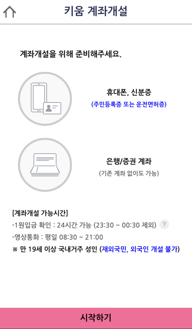 키움증권 계좌개설 앱을 깔고 실행시키면, 다음과 같이 계좌개설을 위한 준비물을 안내해줍니다.